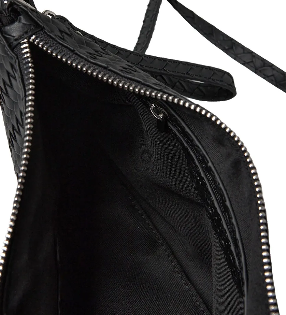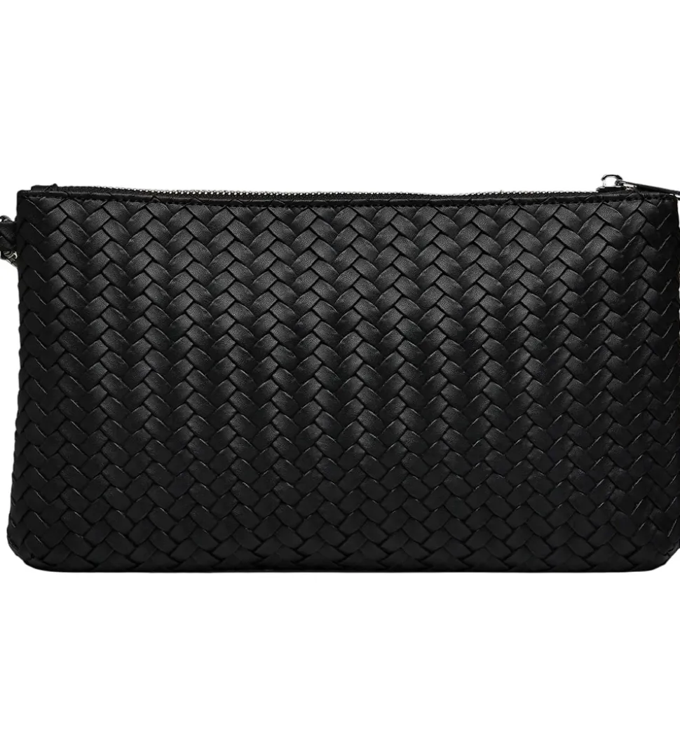 Elegant Rosemunde clutch i imiteret, sort læder med et fint fletmønster.