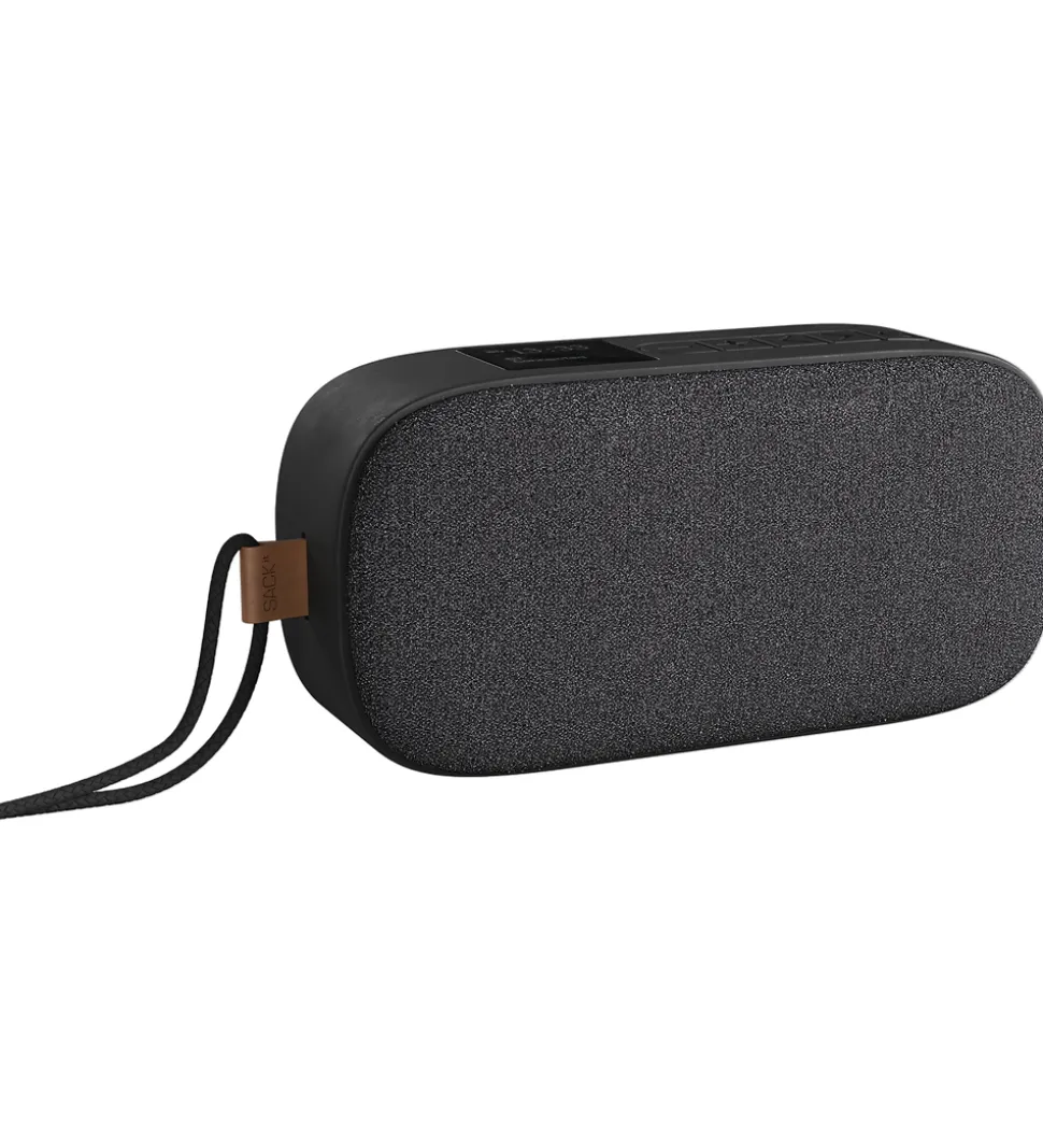 Transportabel SACKit Go 300 højtaler og radio samlet i én. Højtaleren er sort med en tekstilfront i sort.