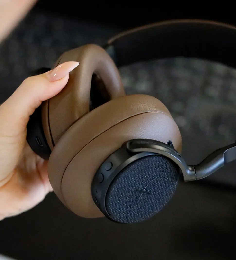 Fede, trådløse SACKit høretelefoner i brun med tekstil og imiteret læder.