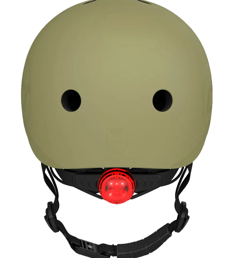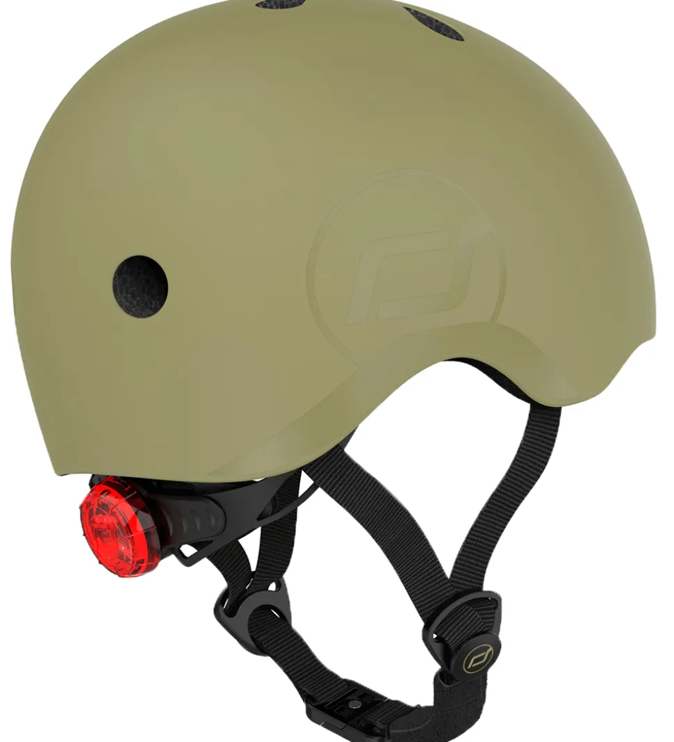 Skøn Scoot and Ride cykelhjelm i olivengrøn med logoprints i begge sider.