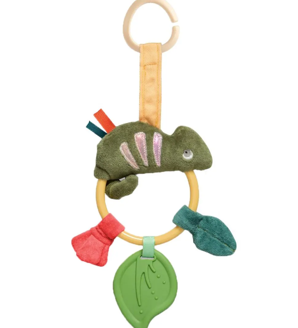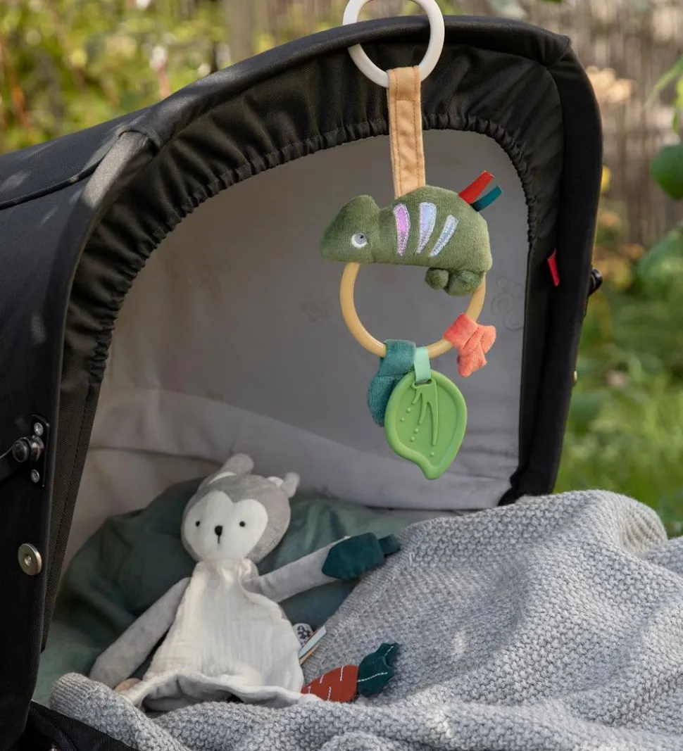 Smart Sebra aktivitetsring, med kamæleonen Carley i toppen. Nedenunder er der en bidering formet som et blad og to nuller-tags med knitrepapir.