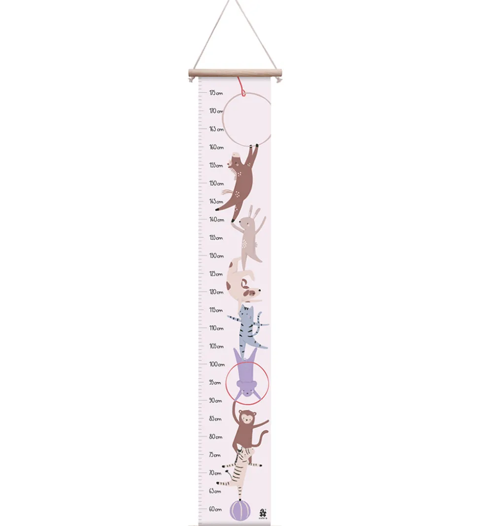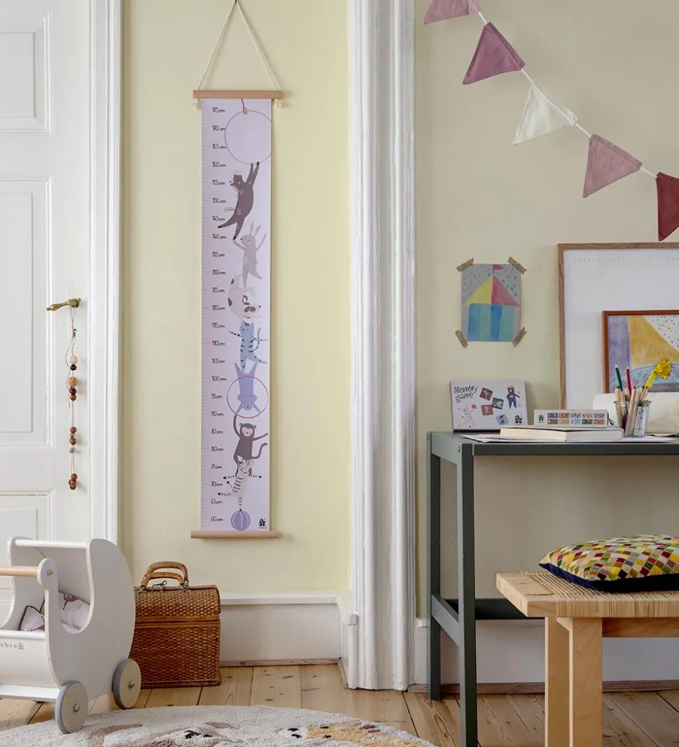 Sebra vægdekorationen er lavet som en højdemåler med centimetermål fra 56-179 cm. Vægdekorationen består af papir, som er monteret mellem to træholdere, og den hænges nemt op med et søm. Barnets højde kan markeres med en tusch eller med små klistermæker direkte på højdemåleren.