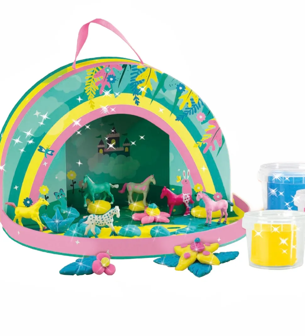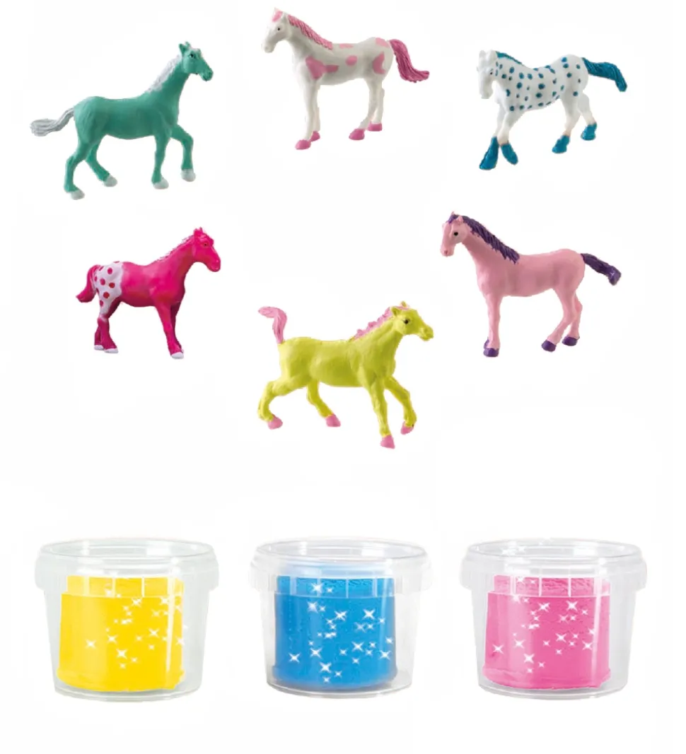 Æsken indeholder en legesæske, 6 heste og 3 bøtter glittermodellervoks.