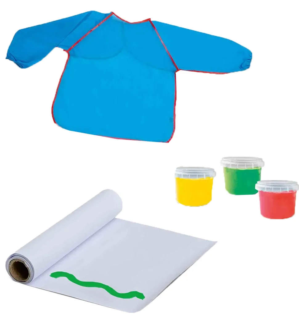 Sjovt SES Creative fingermaling bestående af fire bøtter fingermaling i grøn, gul, blå og rød af 110 ml hver, samt et blåt forklæde og en rulle papir.