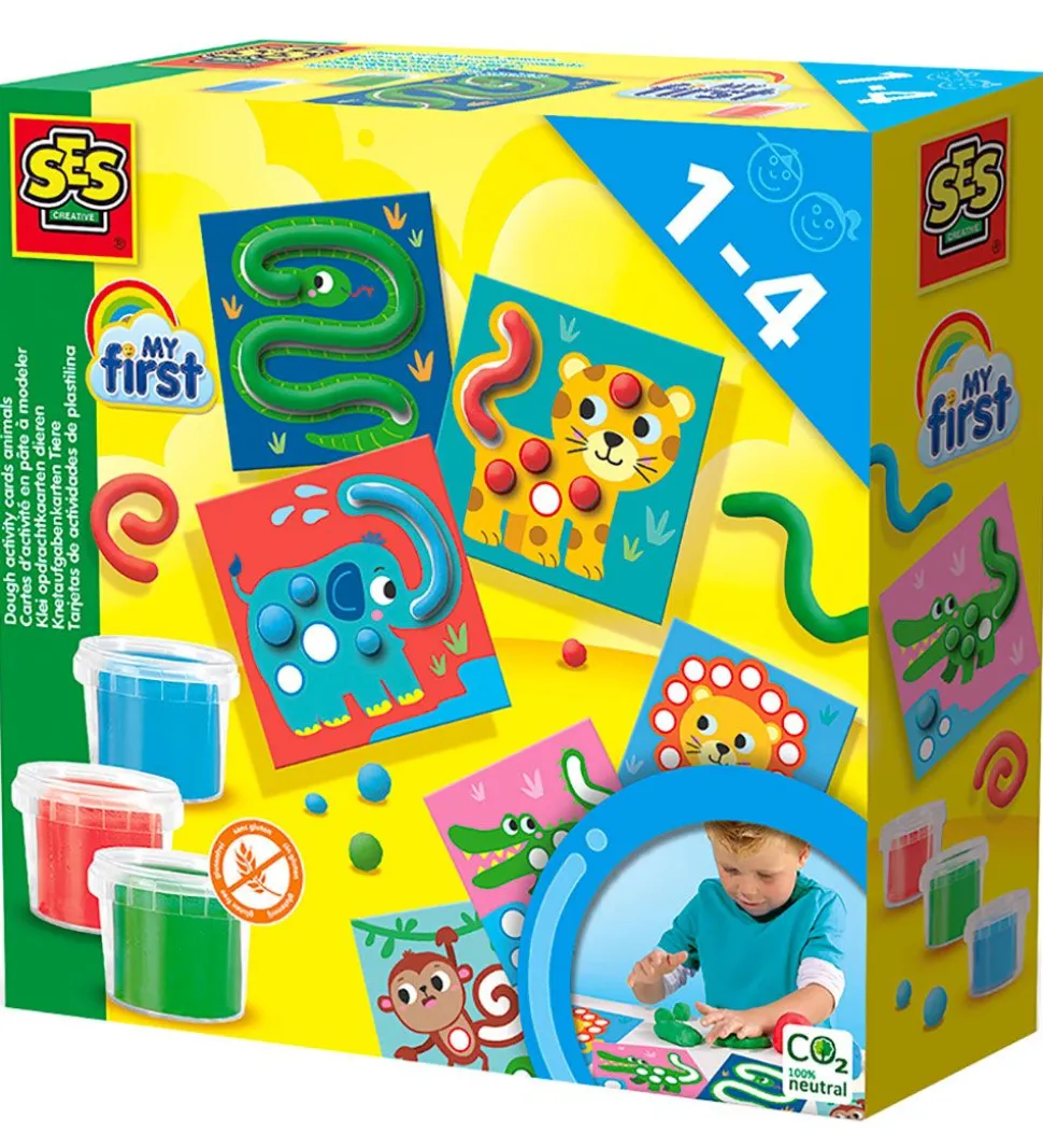 SES Creative sættet er sjovt for de helt små, som skal lege med modellervoks for første gang. De forskellige aktivitetskort har dele uden farve, hvor barnet skal sætte modellervoks for at udfylde de manglende områder.