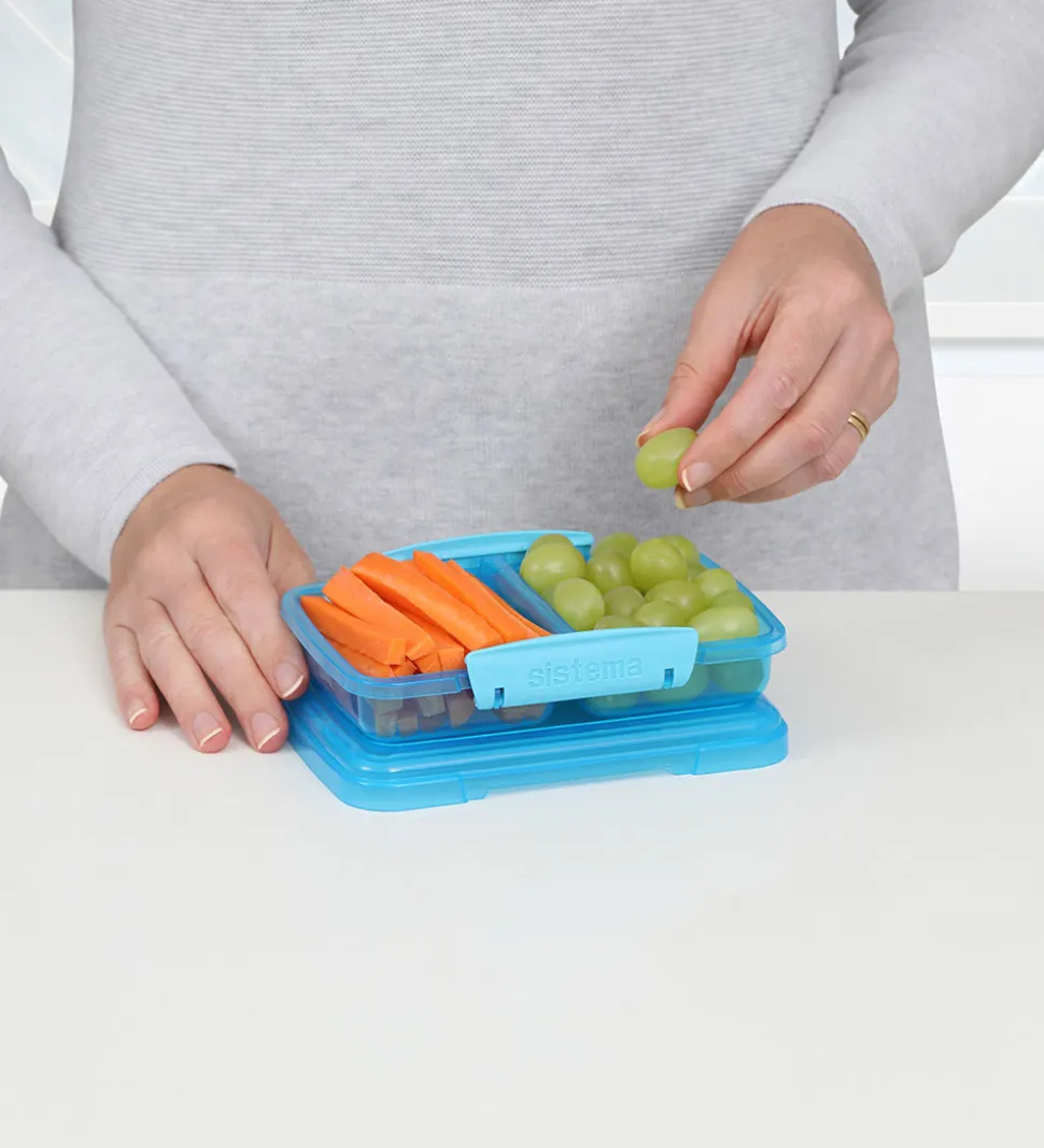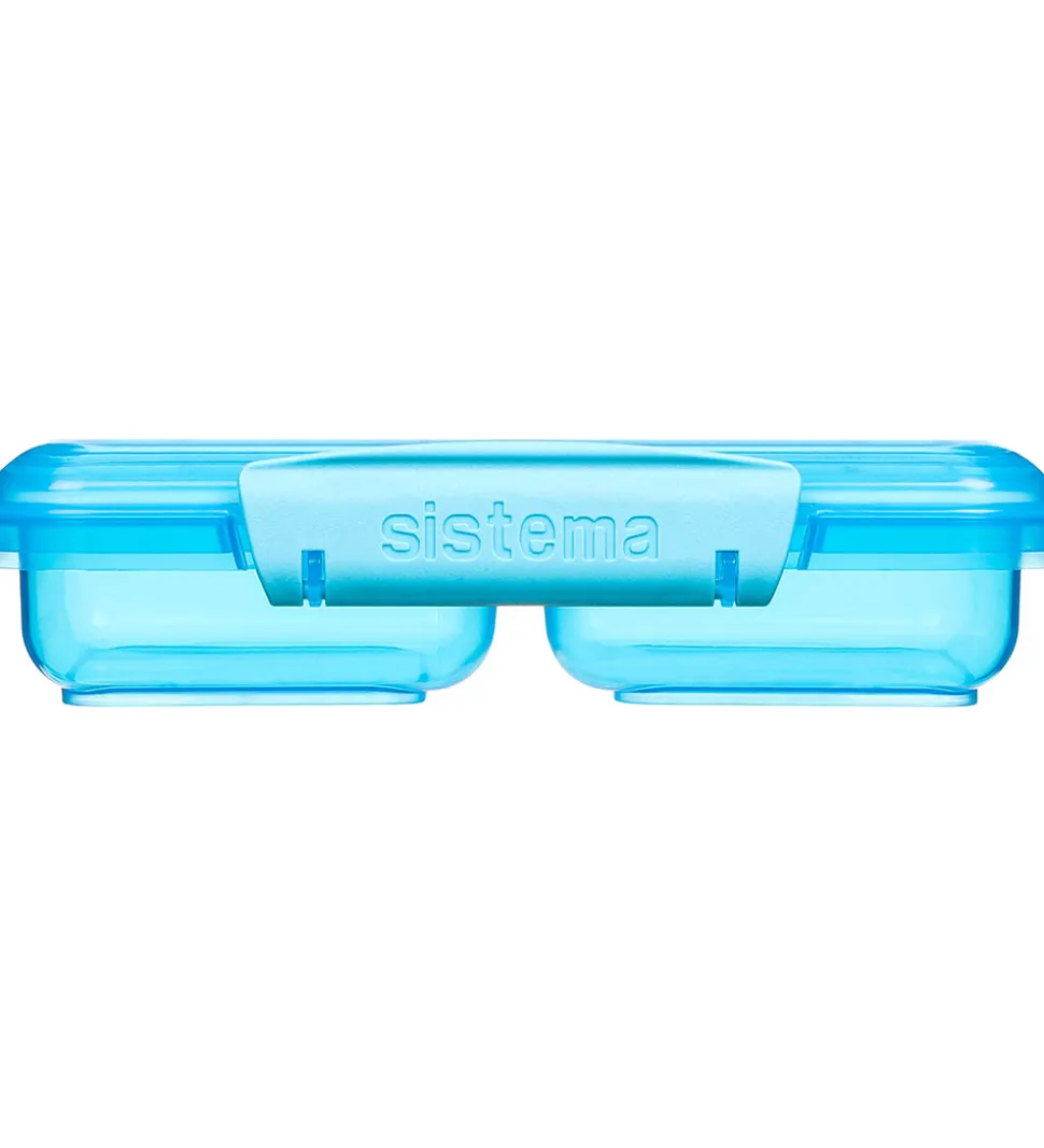 Sistema madkassen har et smart låg, som lukkes med specielle klips på begge langsider. Indvendigt har madkassen 2 lige store rum, der er helt separate i kraft af designet. Madkassen kan derfor uden problemer adskille frugt, snacks el.lign. fra hinanden.