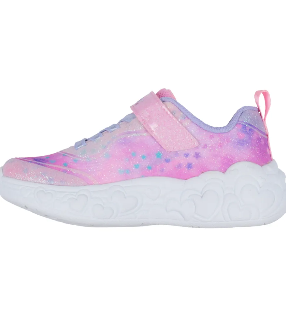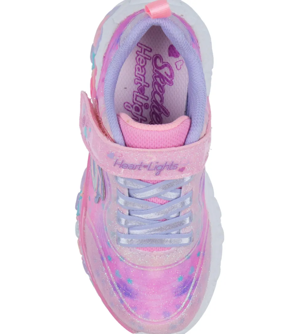Skønne Skechers sko i et skinnende og glitrende farvemiks af rosa og lilla med stjerner og hjerter samt farvet, blinkende lys i ydersålen der aktiveres når barnet går.