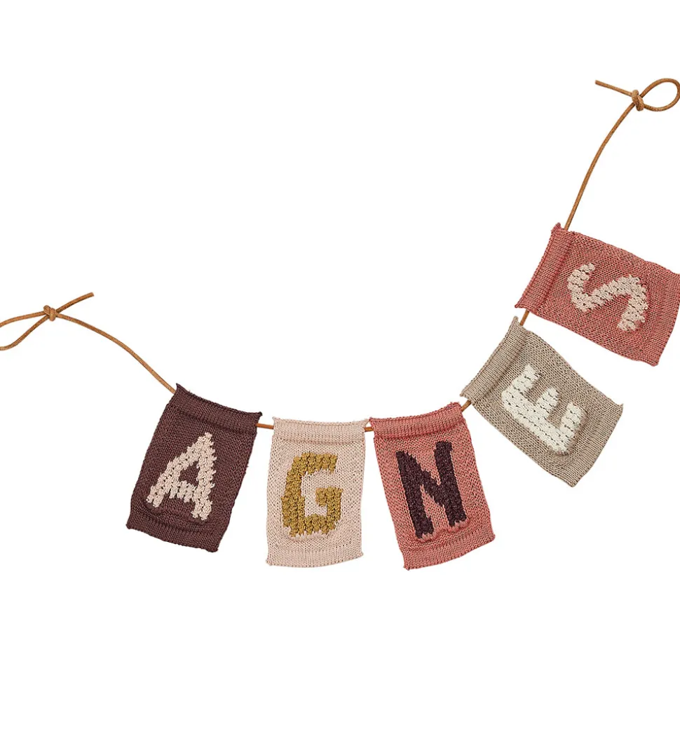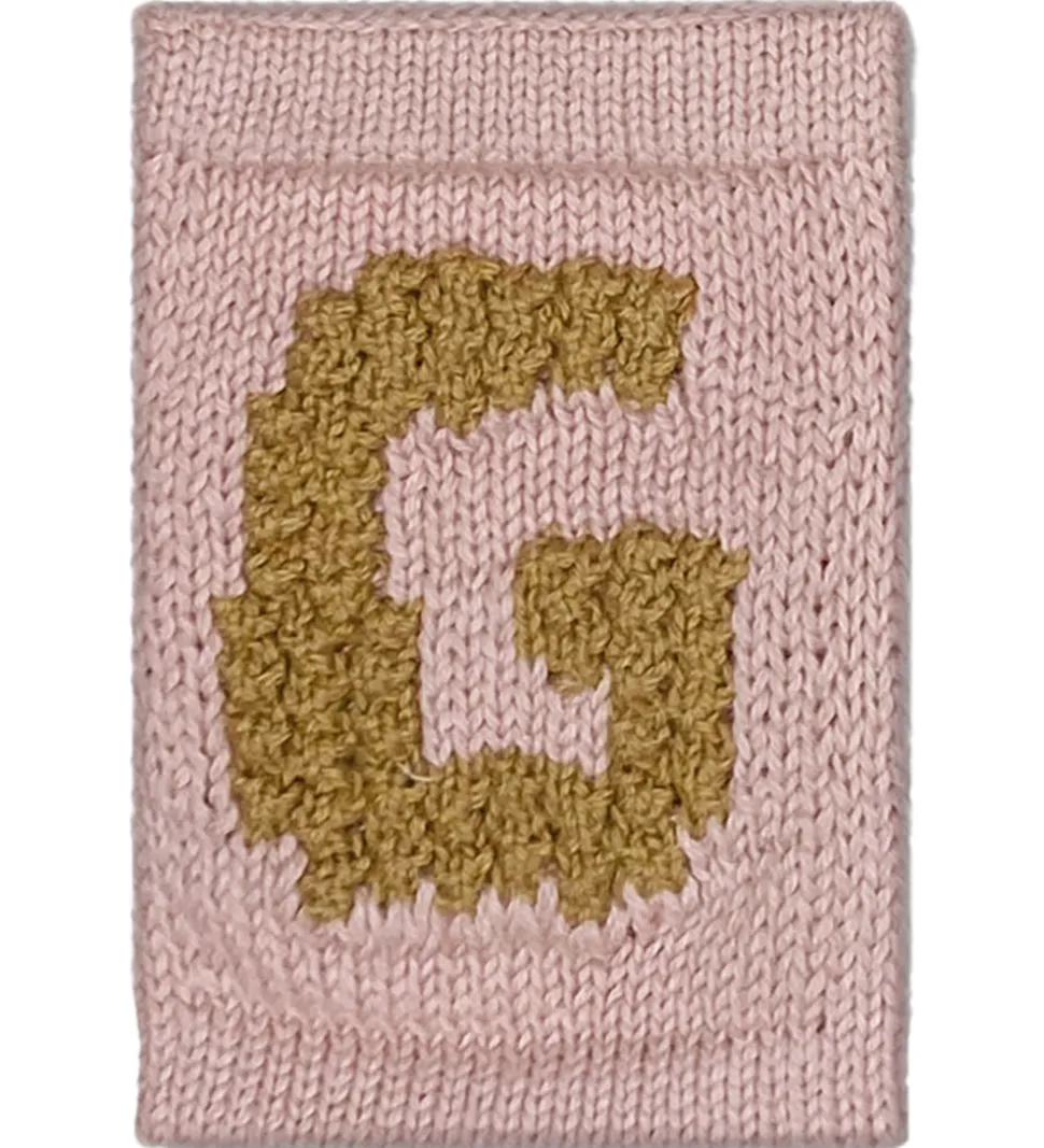 Fin Smallstuff bogstav i rosa med en strikket struktur og bogstavet “G” i gul. Med Smallstuff bogstavet kan du kombinere bogstaver og motiver og danne en sød flagranke med barnets navn.