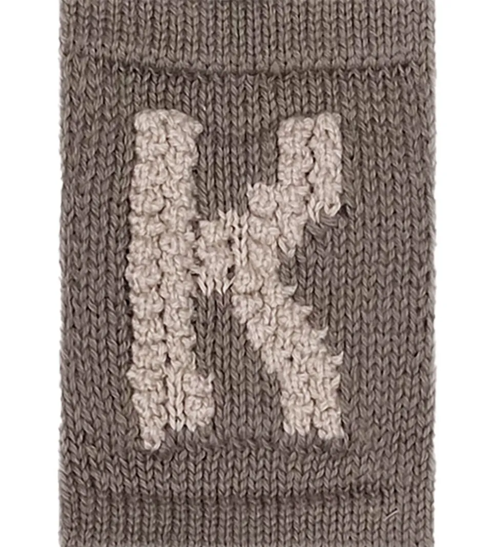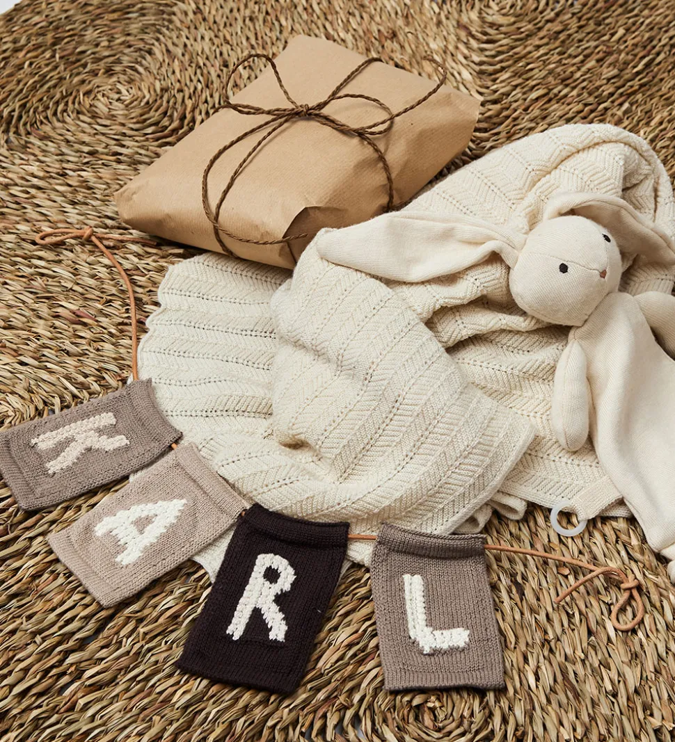 Fin Smallstuff bogstav i lysebrun med en strikket struktur og bogstavet “K” i beige. Med Smallstuff bogstavet kan du kombinere bogstaver og motiver og danne en sød flagranke med barnets navn.
