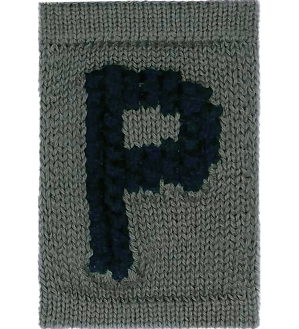 Fin Smallstuff bogstav i grøn med en strikket struktur og bogstavet “P” i mørkeblå. Med Smallstuff bogstavet kan du kombinere bogstaver og motiver og danne en sød flagranke med barnets navn.