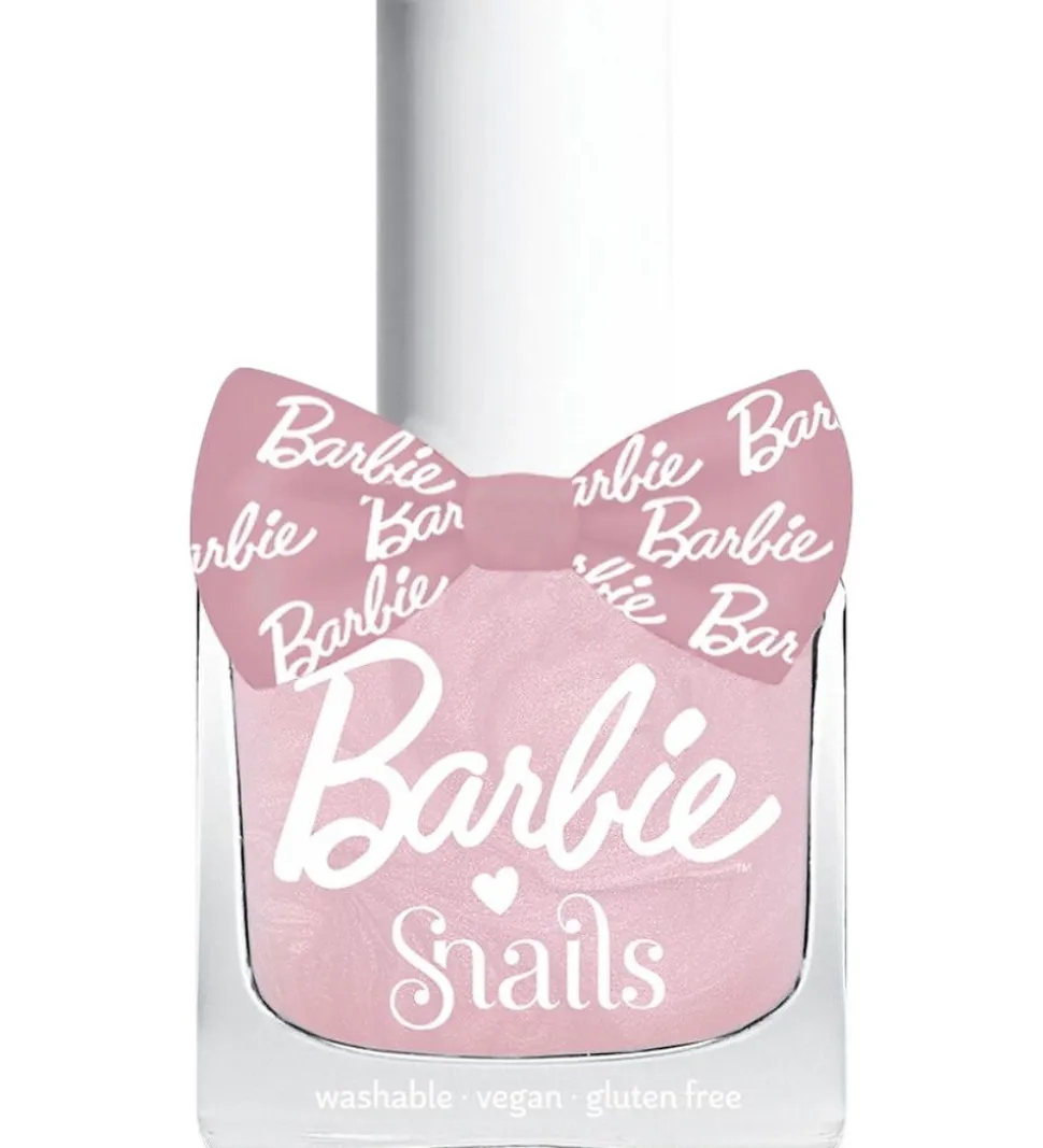 Fin Snails neglelak i lys rosa. Neglelakken har et design med Barbie-print, og kan lave neglene flotte, så de passer til et festligt outfit. Snails neglelakken er let at vaske af, vegansk og glutenfri.