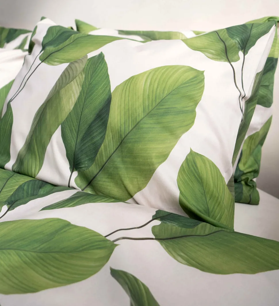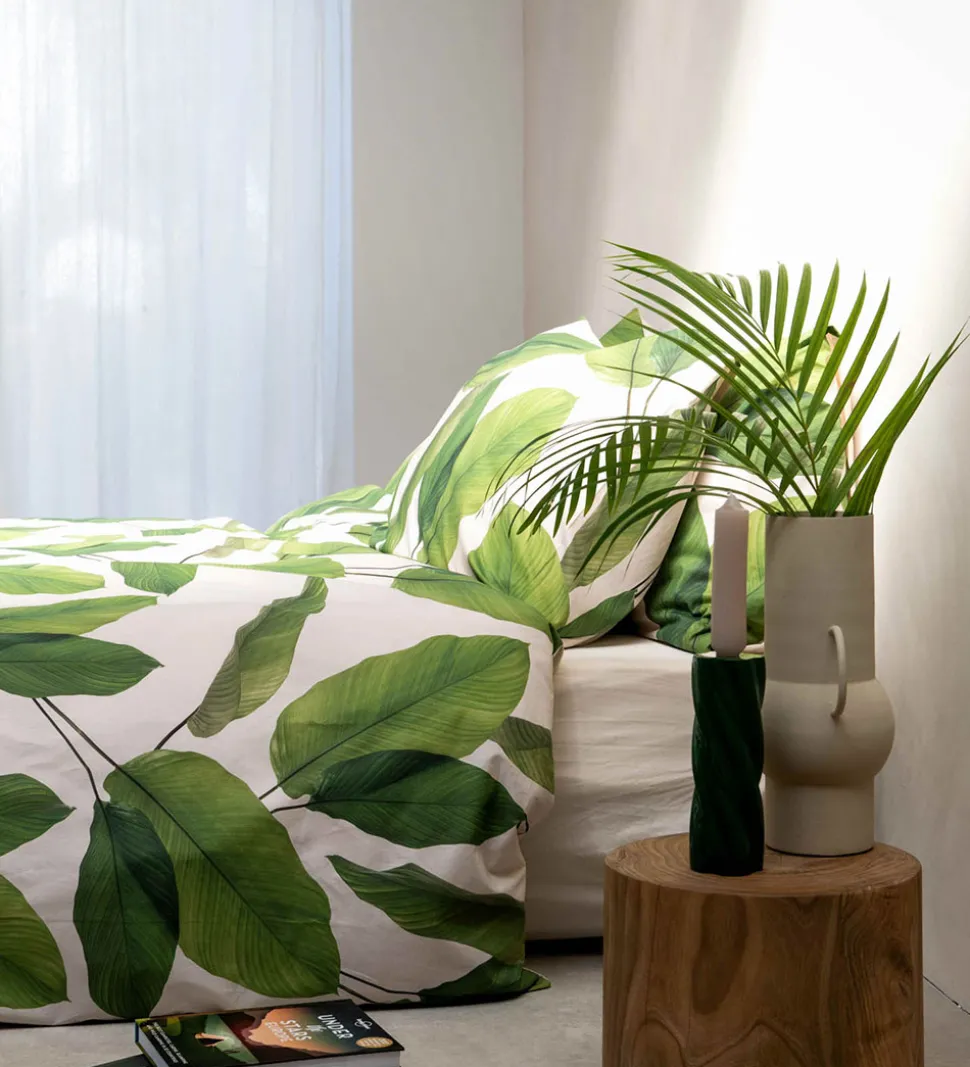 Flot Snurk sengetøj i lys beige med print af grønne blade. Snurk sengetøjet består af et hovedpudebetræk med foldelukning, og et dynebetræk som lukkes med en lynlås i bunden. Sengetøjet skaber en hyggelig atmosfære i soveværelset.