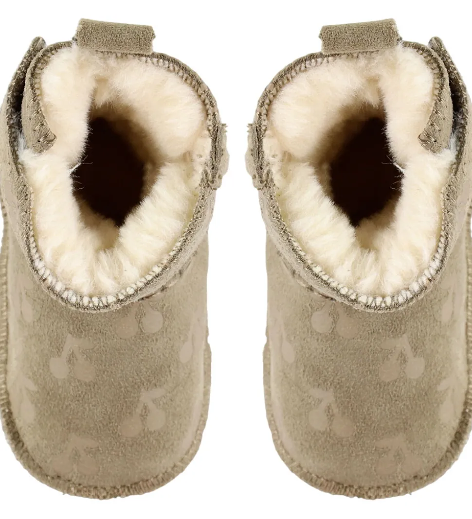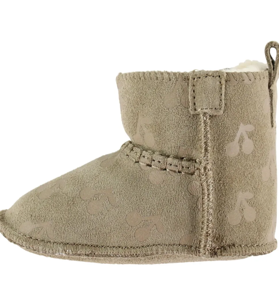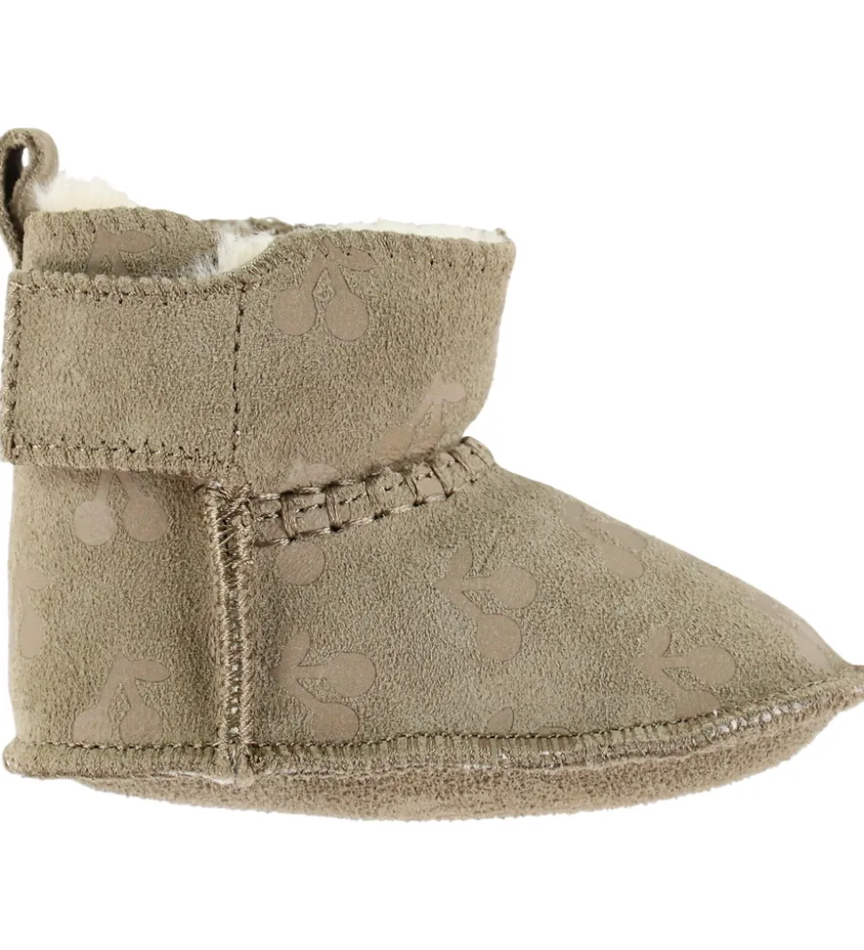 Flotte Sofie Schnoor skindfutter i mørkebeige ruskind med kirsebærprint.