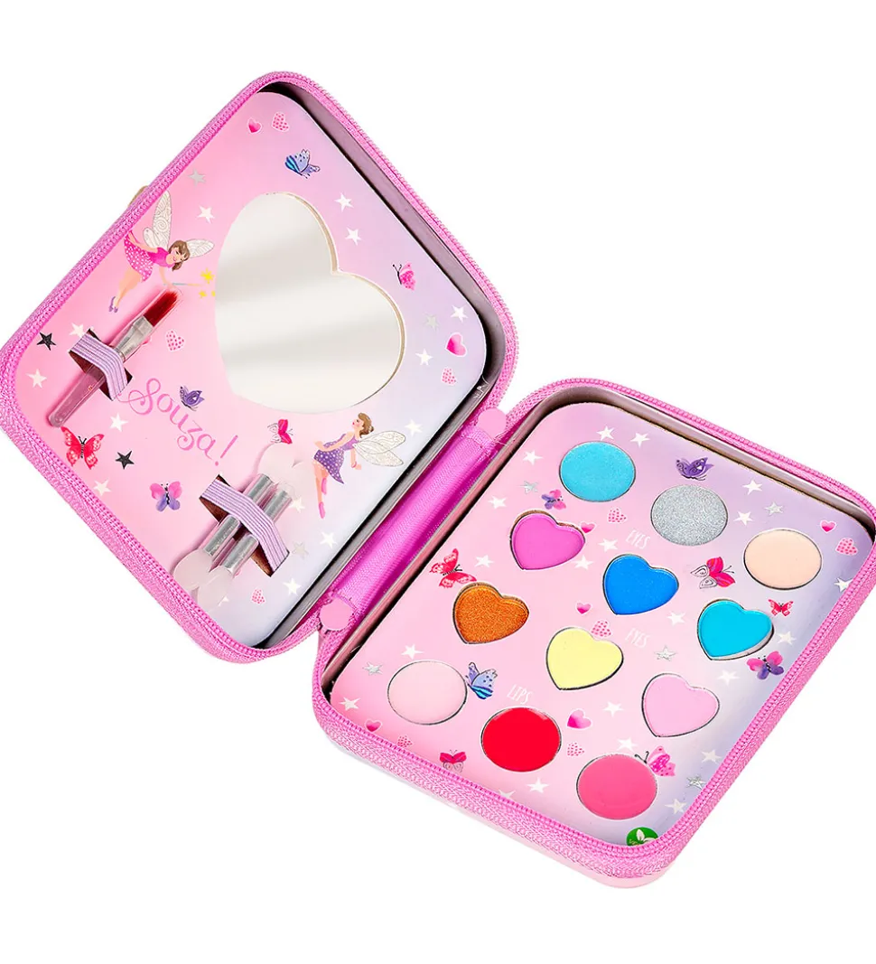 Sminkesættet kommer i en fin metal-opbevaringsæske med lynlåsåbning, og indvendigt er der også et hjerteformet makeup-spejl.