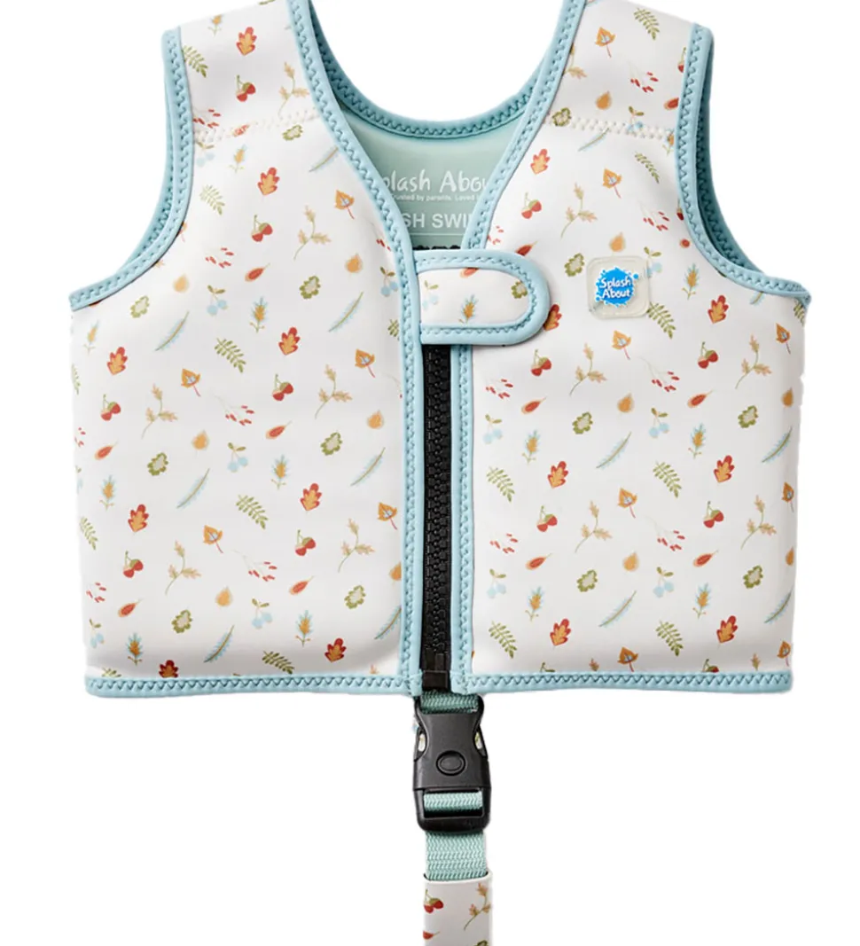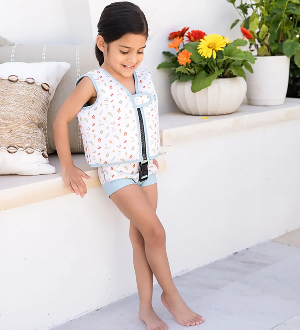 Skøn Splash About svømmevest i cremehvid med lyseblå kanter. Svømmevesten har et farverigt alloverprint af blomster og blade. På venstre bryst er der et logo i gummi. Splash About svømmevesten har brede skulderstropper og vesten åbnes fortil med en lynlås og en velcrostrop.