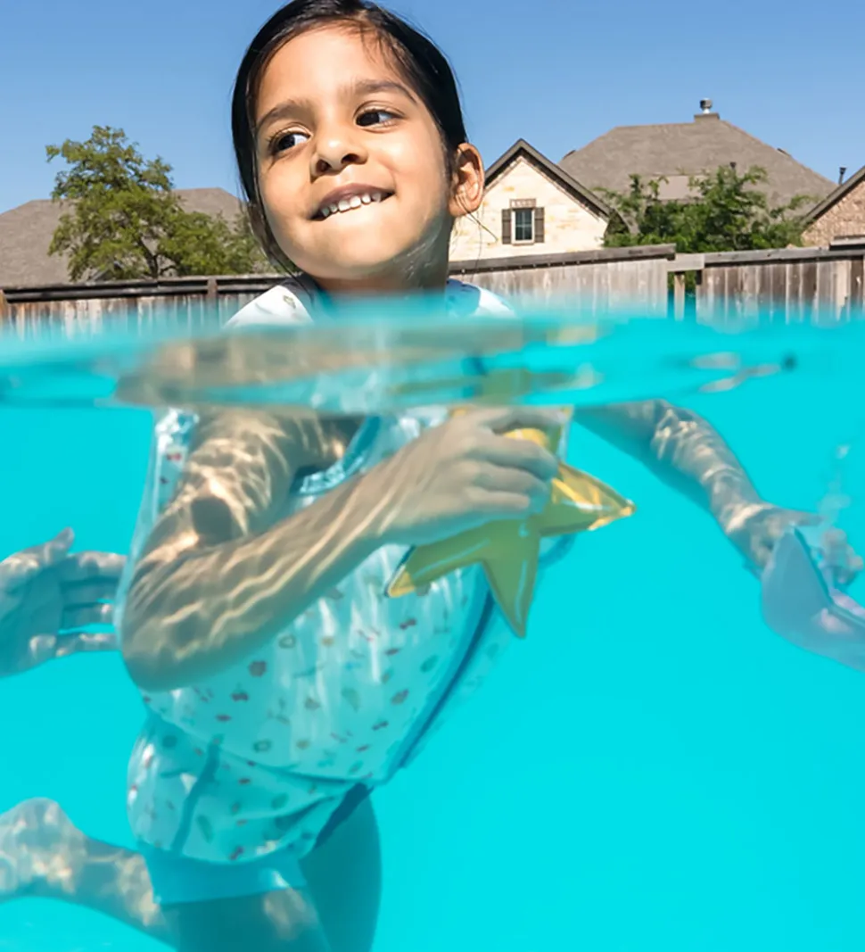 Svømmevesten hjælper barnet med at holde sig flydende.