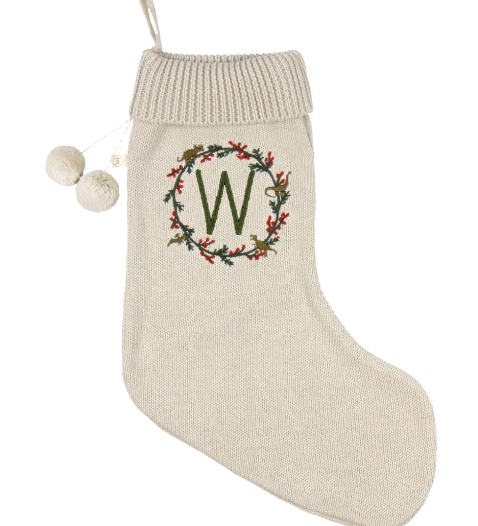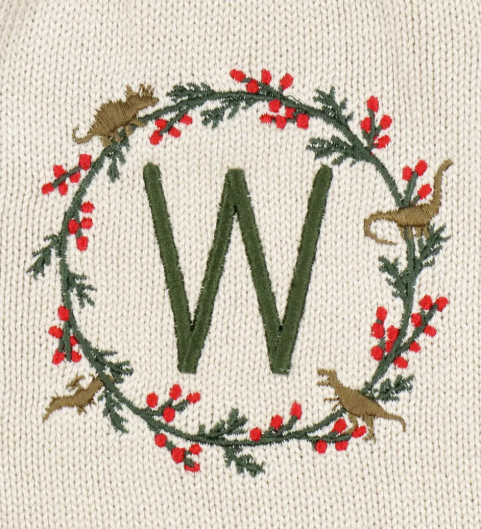 Fin That’s Mine julesok i beige strik med et broderet, grønt “W” og en broderet julekrans i grøn med røde bær og brungrønne dinoer på skaftets ene side. Der er også to pomponer i snor ved julesokken åbning.