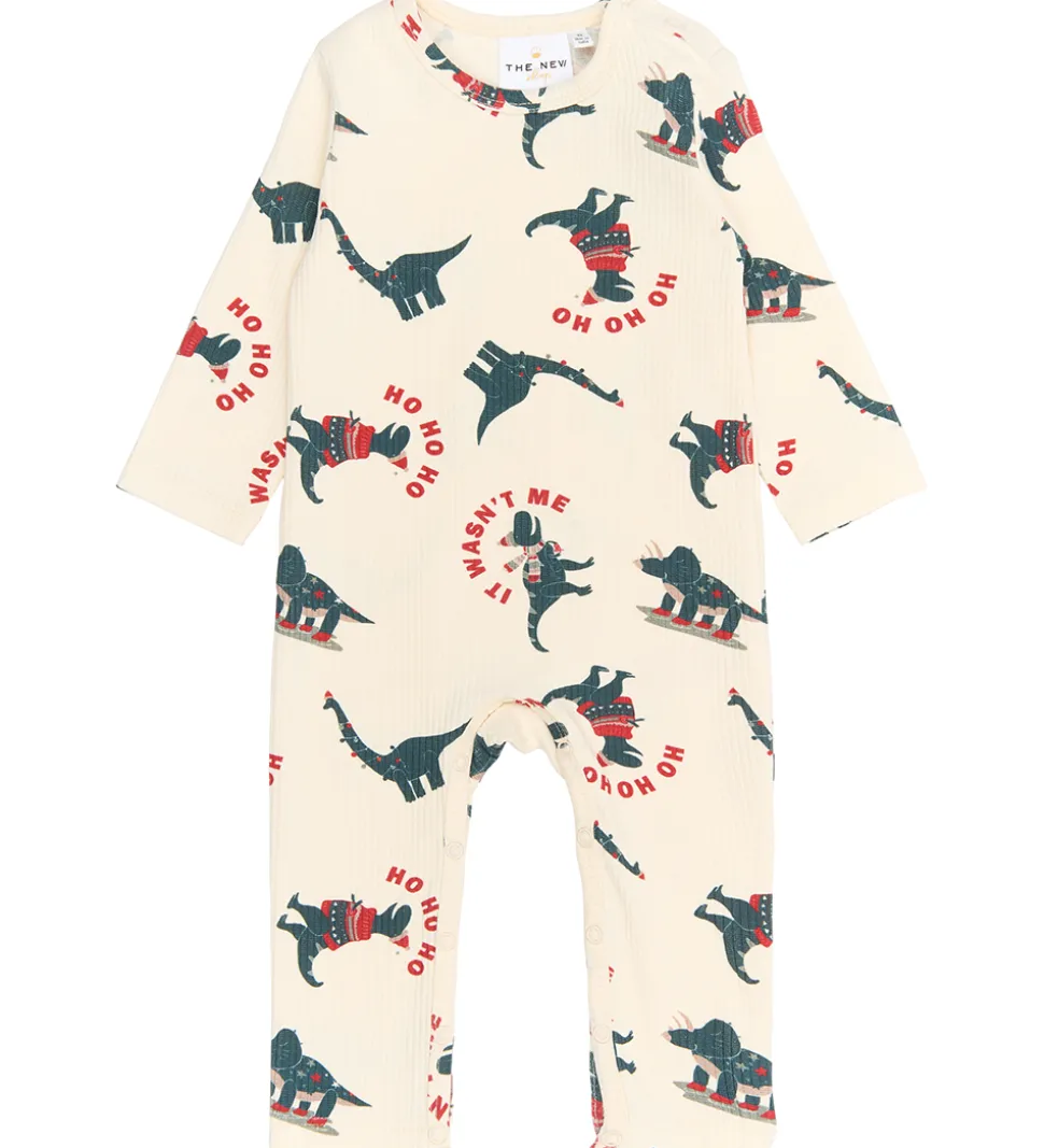 Charmerende heldragt fra The New Siblings i cremehvid med et sjovt dinosaurprint. Printet har forskellige motiver med tekster som “HO HO HO” og “WASN’T ME”.