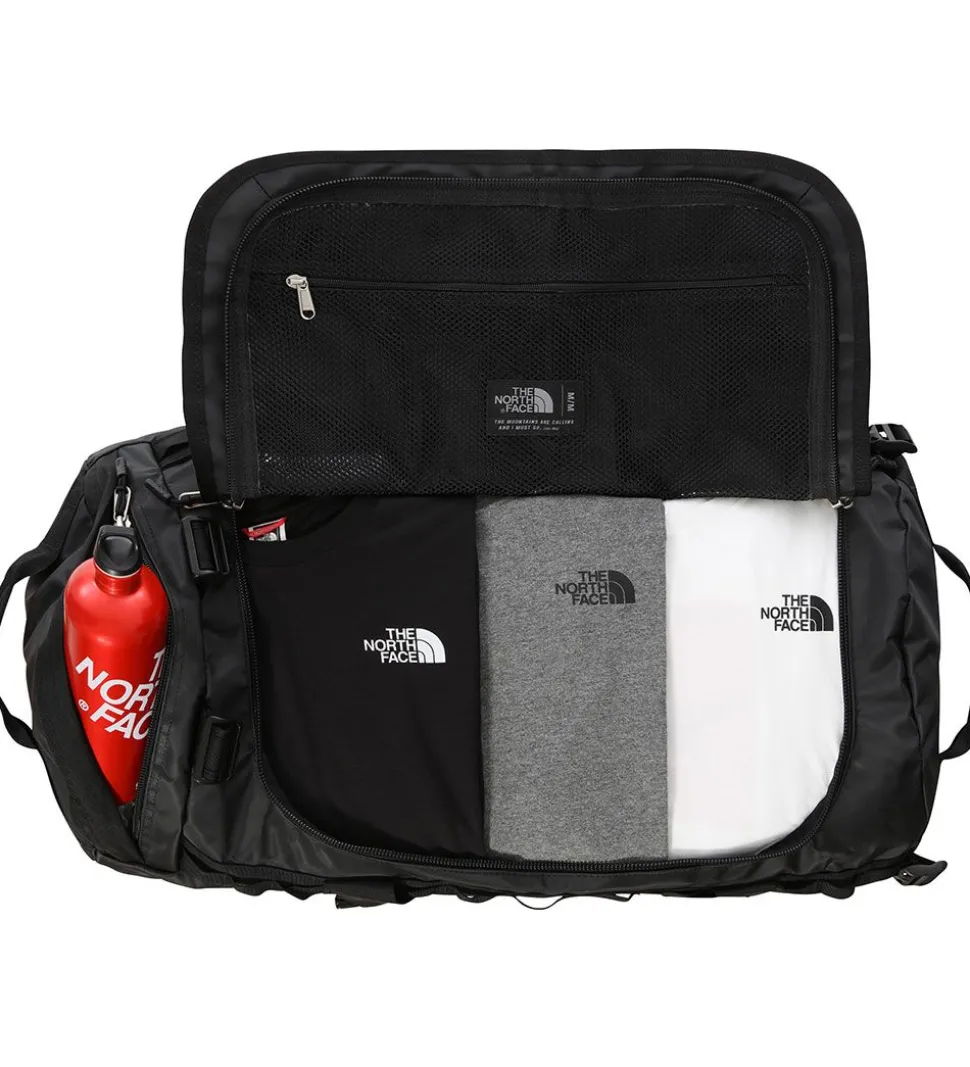 The North Face rejsetasken har en D-formet åbning med lynlås og vandafvisende lynlåsflap. I hovedrummet er en meshlomme med lynlås. Tasken har et håndtag i hver side samt to på toppe, så den kan bæres i hånden.