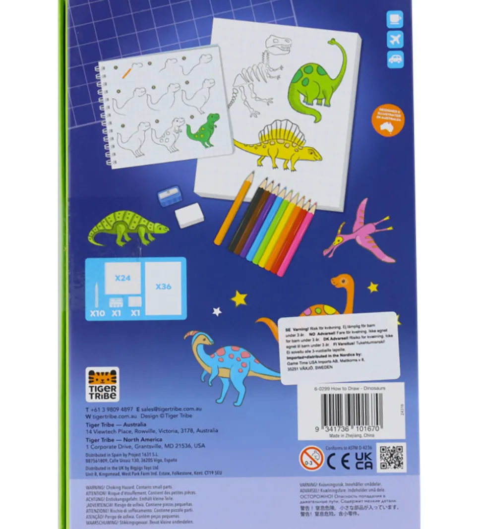 Tiger Tribe tegnesættet lærer dig at tegne flotte tegninger. Det består af en praktisk opbevaringsæske med en blyant samt 9 farveblyanter, et viskelæder og en blyantspidser, en bog med trin for trin-vejledninger til 24 forskellige dyr samt en ternet skitseblok med 36 sider.