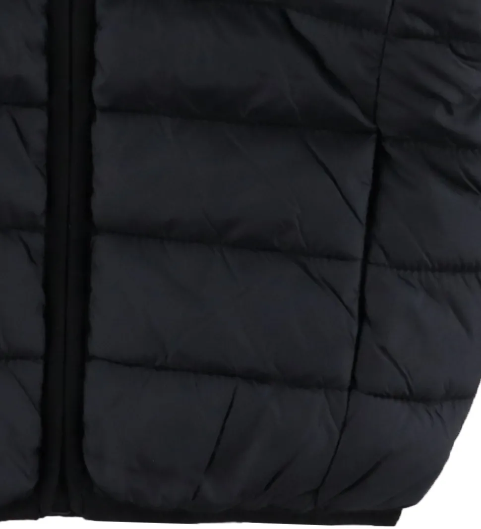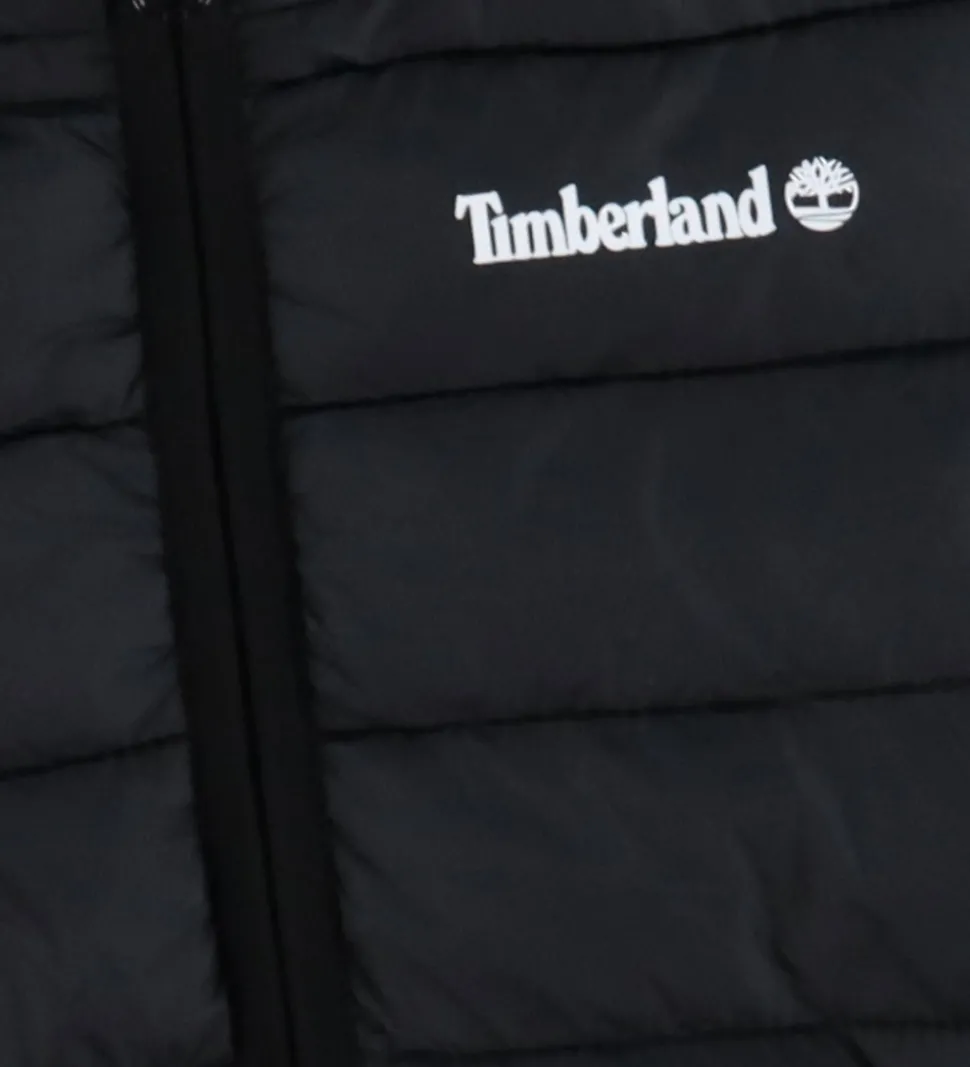 Klassisk Timberland dynevest i sort med vandrette syninger. Indvendigt har den et brunt for. Dynevesten har en hætte og lynlås foran samt to lommer i siderne. Timberland logoet er diskret placeret på brystet som en fin detalje.