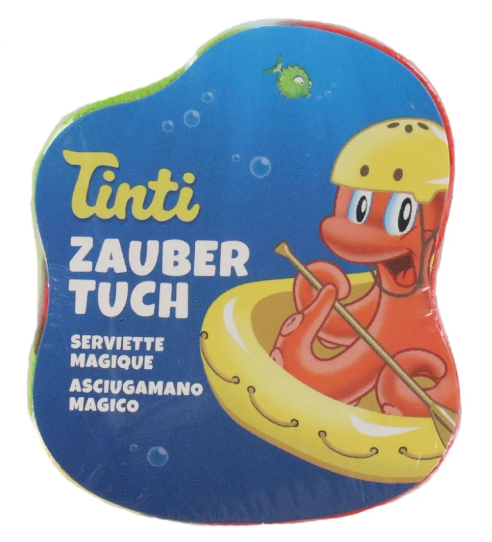 Tinti vaskekluden kommes i badevandet, hvorefter den vil blive større som en rigtig vaskeklud. Motivet på kluden ændrer sig, så barnet får en sjov oplevelse.