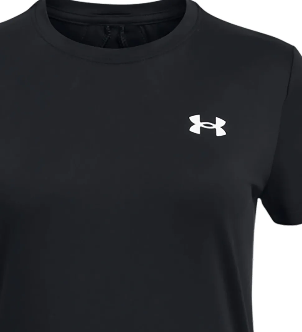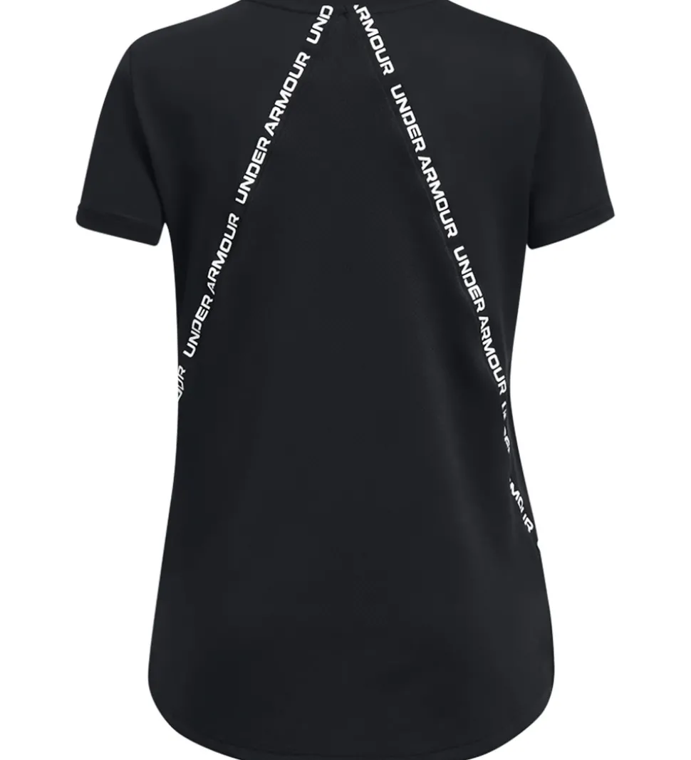 Flot Under Armour t-shirt i sort, og på ryggen er der to sorte logostriber med navnet “Under Armour” i hvid.