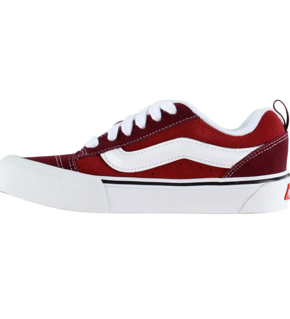 Smarte Vans sko i mørkerødt ruskind i to forskellige nuancer. Skoene har hvide 3D-logoer på siderne samt hvide snørebånd og hvide ydersåler.