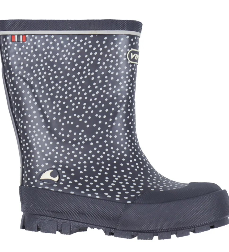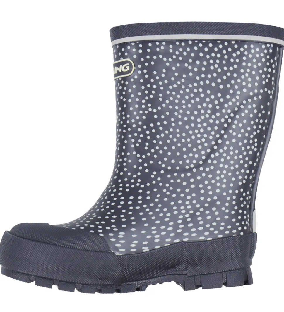 Fine Viking termostøvler i navyblå med et alloverprint af små hvide prikker. Fortil er der et hvidt logo og bagpå er der en praktisk refleks.
