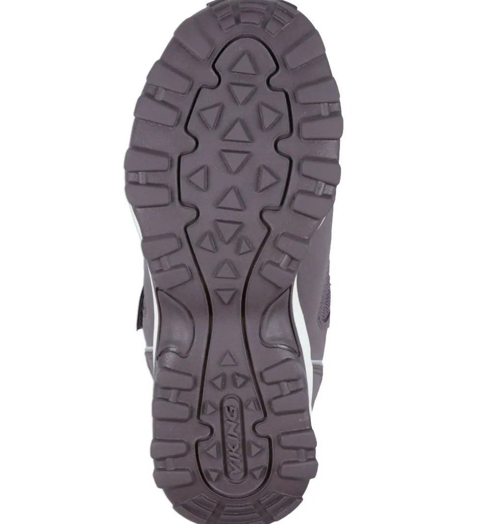 Viking vinterstøvlerne er en halvhøj model, som lukkes fortil med velcrobånd. Bagtil er der en praktisk strop, og vinterstøvlerne har fast hælkappe, som giver god støtte og beskytter fødderne. Indvendigt er der lilla tekstil og sort, imiteret uld, og i bunden er der udtagelige indersåler. Ydersålerne er fremstillet i letvægtigt og fleksibelt materiale med et groft skridmønster under bunden, som sikrer et godt fodfæste.