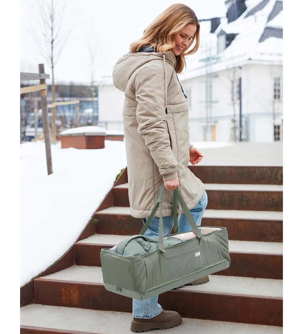 Voksi babyliften har en klassisk, rektangulær udformning med sider og brund af åndbart 3D air-mesh samt en integreret, fiberplade i bunden for stabilitet. Den har Soft Release-hjørner, bæres i to bærehanke og kan foldes helt fladt ud som legetæppe. Babyliftens topcover er vind- og vandafvisende, giver ekstra beskyttelse og kan nemt sættes af og på med lynlås.