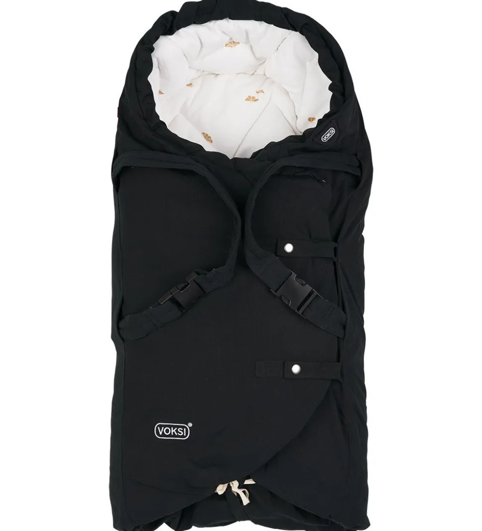 Voksi køreposen er en varmere version af den almindelige Voksi Carry. Den lukkes sammen om barnet med korte remme med sølvfarvede trykknapper med flere indstillinger, så lukningen kan tilpasses det enkelte barn. I toppen kan køreposen strammes ind med en snor, der er gemt i en lille lomme med velcro. Voksiposen kan også åbnes helt op og bruges som et legetæppe.