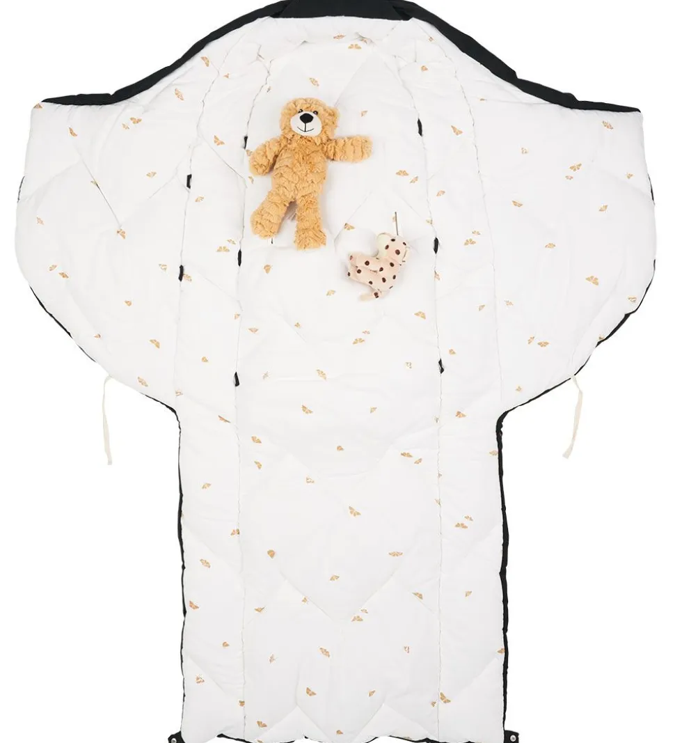 Varm Voksi kørepose i sort, og på indersiden er den hvid med beige sommerfugle.