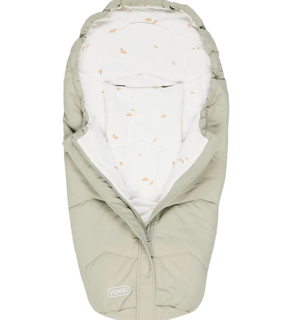 Lækker Voksi kørepose i modellen Move Light i støvet grøn og med et hvidt for med print af små, beige vinger. Denne model egner sig godt til autostole og klapvogne.