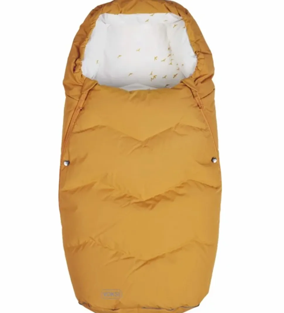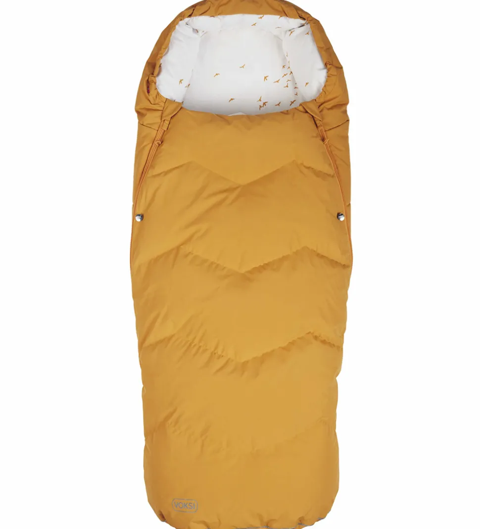 Voksiposen har et for af bomuldsjersey i hvid med et alloverprint med karrygule fugle, og i forstykket er den vatteret med dun og fjer, mens der er et lækkert uldfor i ryggen.