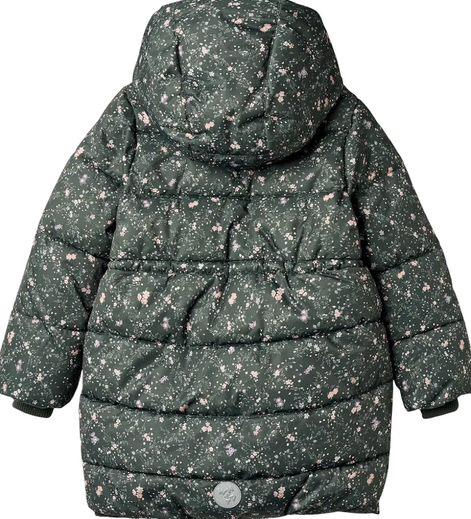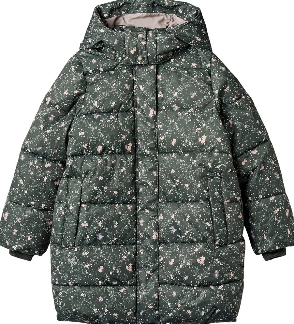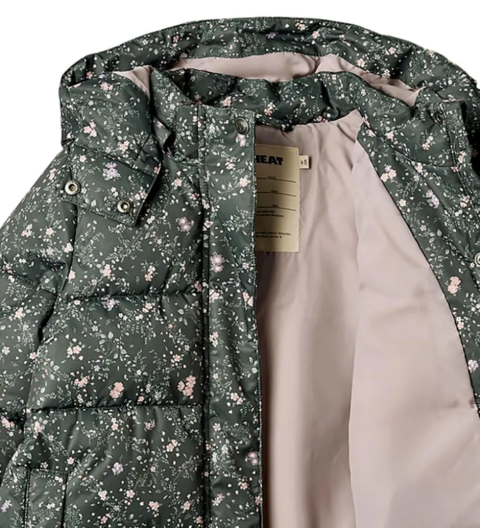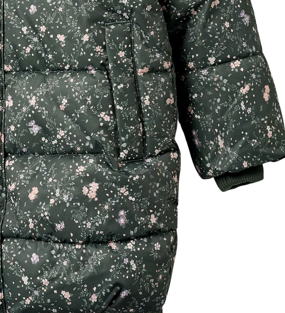 Lækker Wheat dynejakke i mørkegrøn med et småblomstret alloverprint i rosa, lilla og grønne farver. Dynejakken har vandrette syninger.