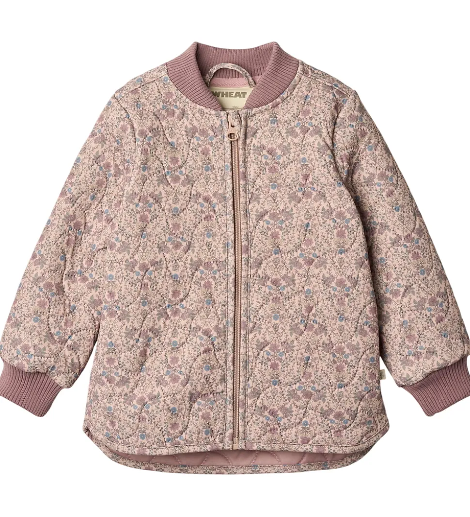Skøn Wheat termojakke i lys rosa med et alloverblomsterprint i støvede lilla, blå og grønne nuancer og med ribkanter i støvet lilla. Termojakken har en bølgende, quiltet struktur.